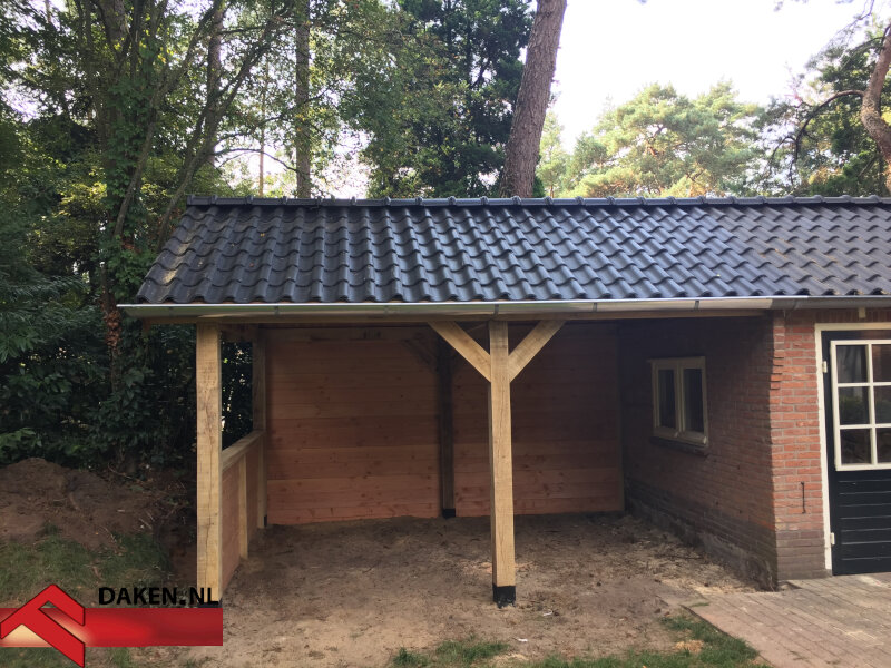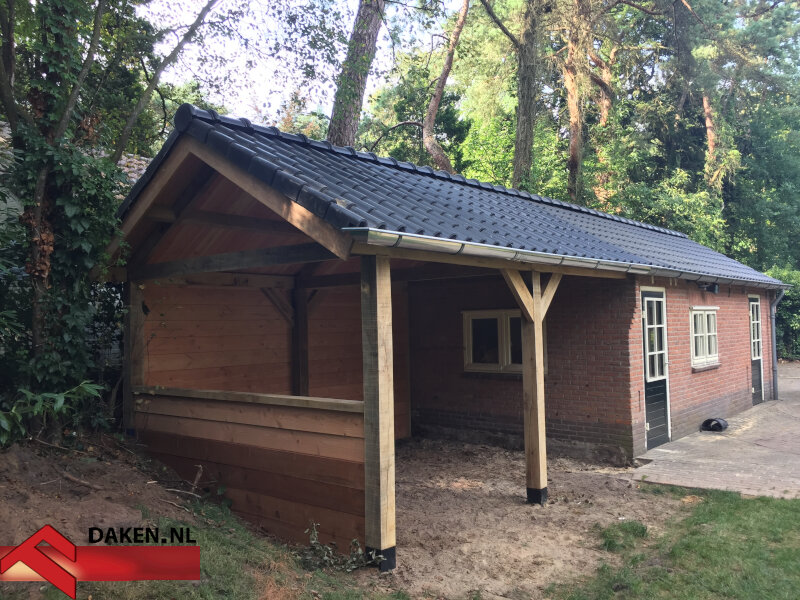 Het dak werd verlengd met hetzelfde type dakpannen (Koramic OVH in Zwart Satinette), waardoor een visuele eenheid ontstond met de bestaande garage. De achterwand en zijwand zijn bekleed met Zweeds rabat van Douglas hout, terwijl een extra damwand van Bankirai hout extra stevigheid en vochtafscheiding biedt. Tot slot verlengden onze vakmensen de bestaande zinken dakgoot en werkten het geheel af met boeidelen en schoren.