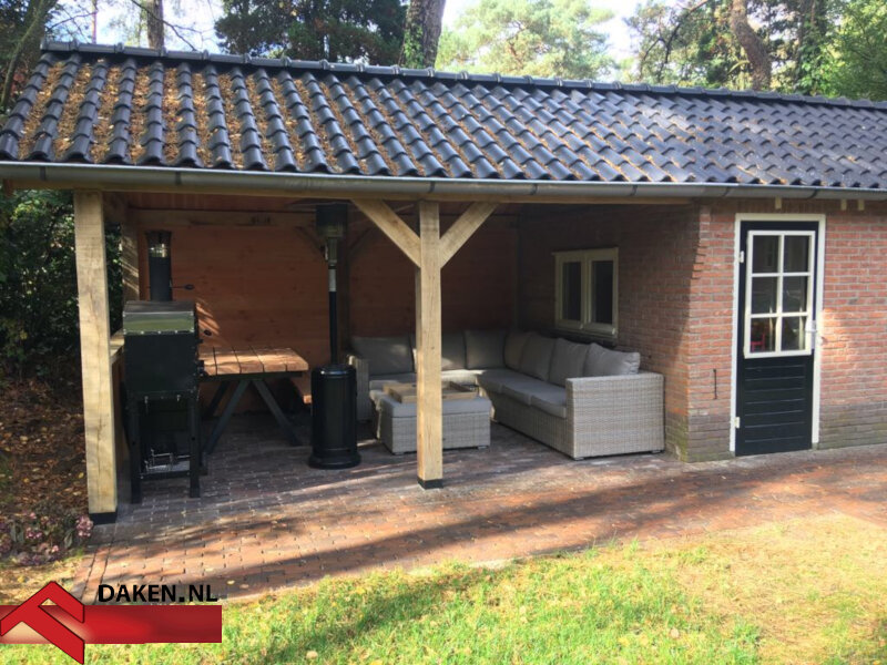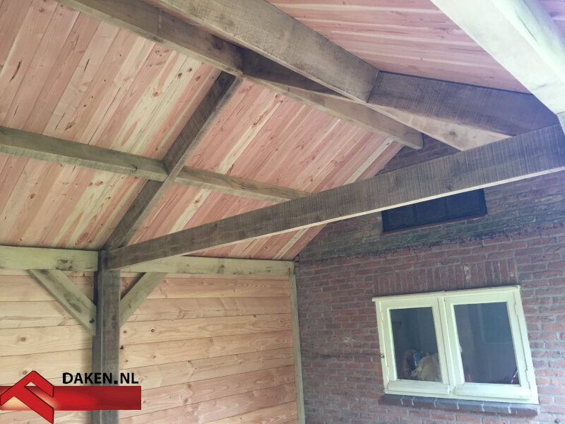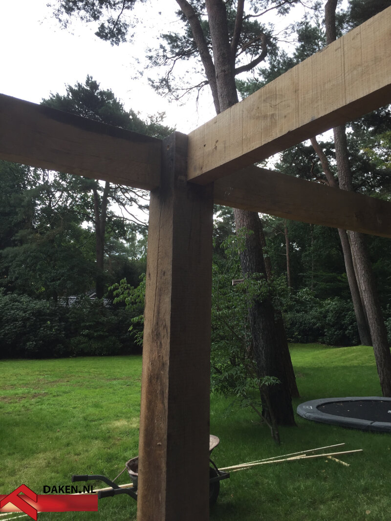 De bewoners van een woning in Soest wilden graag een comfortabele loungeplek in de tuin, aansluitend op hun bestaande garage waarvan Abeco Daken eerder al de dakpannen had vervangen. Na een zorgvuldige inventarisatie van de wensen ontwierp en bouwde Abeco Daken een robuuste overkapping uit massief eikenhout. De constructie is opgebouwd met traditionele houtverbindingen, gezaagd met de kettingzaag — het belangrijkste gereedschap bij dit project. Het resultaat is een ambachtelijk bouwwerk met een spannend contrast tussen het donkere dak en het warme eikenhout, dat perfect past in de natuurlijke omgeving van de Soesterduinen.