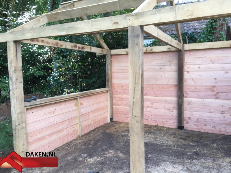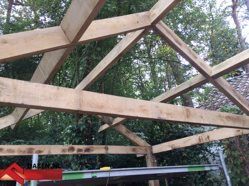 Abeco Daken begon met het ontwerp en de constructieve berekening van de overkapping. Vervolgens werd het frame opgebouwd uit massieve eiken balken, voorzien van handgezaagde houtverbindingen. Het gebruik van zware, harde materialen vroeg om precisie en vakmanschap — de kettingzaag was hierbij het belangrijkste hulpmiddel.